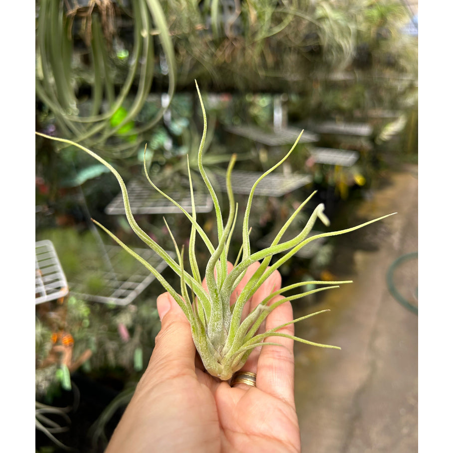 This air plant is a mixture of light green and silver. But unlike most plants, the silvery tones in this one is much more visible. Its leaves are thick at the base but get thinner at the tips where it becomes pointy. They extend upwards forming into delicate waves. Over time as this plant matures, its leaves grow long in all directions and decrease in width, appearing thinner and more elegant. But do not worry because even as it grows it is still able to maintain its natural waves. The T. caput-medusae is also capable of blooming gorgeous violet flowers and bright red bracts that give the plant a pop of color. So, when all three of these beautiful features are combined, the plant can be turned into a very fancy home decor.